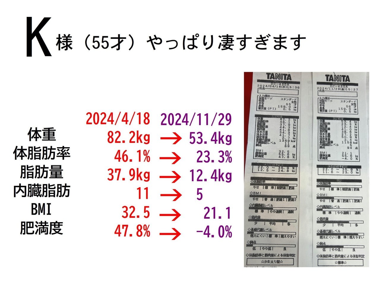 3ヵ月でここまでとは思っても居ませんでしたが、70歳代だからと絶対あきらめませんでした。内科医の先生にどうしたの?数値が良くなってると驚かれ良いダイエットをしましたねと言われました。